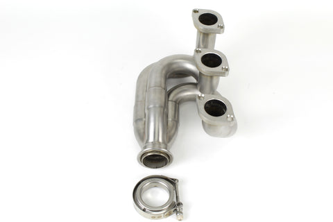 Equal-length stainless steel tubular headers with 3-into-1 merge collectors, terminating in v-band clamps (matching weld flanges and clamps included).